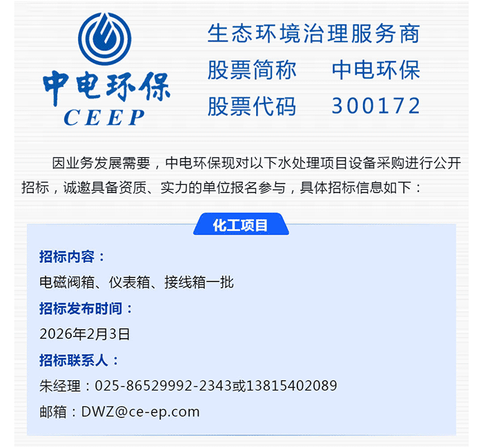 中電環(huán)保股份有限公司是南京市首家環(huán)保上市公司(股票簡稱:中電環(huán)保,股票代碼:300172),南京環(huán)保產業(yè)協(xié)會會長單位,國家級聯(lián)盟理事長單位,是生態(tài)環(huán)境治理服務商,主營(3+1):水務、固危廢、煙氣治理及產業(yè)創(chuàng)新平臺,包括:工業(yè)水處理、污水處理及水環(huán)境綜合治理;固危廢土壤、污泥餐廚垃圾處理;煙氣及VOCS治理;智慧環(huán)保;高端裝備等。